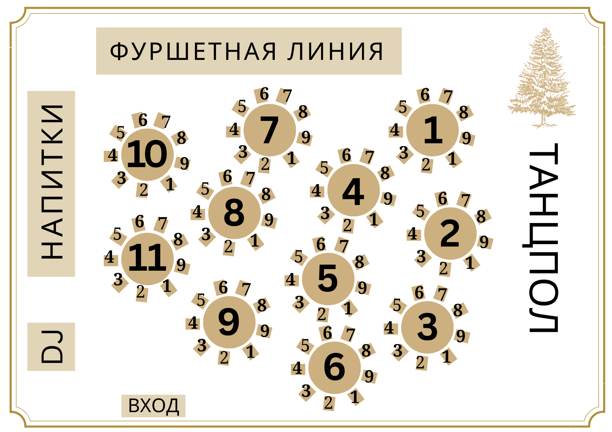 Выберите понравившийся столик на плане рассадки и закрепите за собой место по телефону — так вы сможете быть рядом с близкими и наслаждаться праздником без забот.
